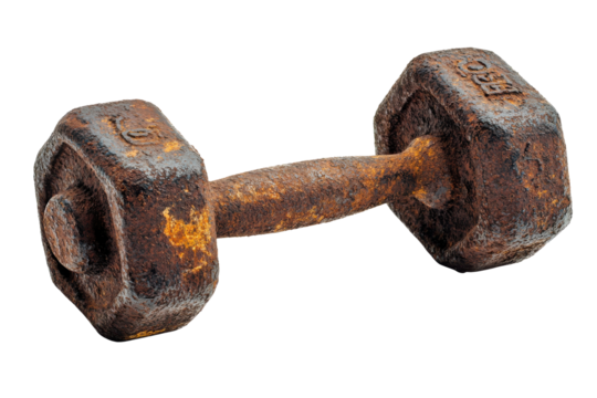 Old rusty dumbbell isolated on transparent background. Rusty iron dumbbell with patina vintage look perfect for rustic gym decor isolated on white background.