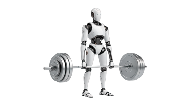 Isolated Metallic Robotic Hand Lifting Heavy Barbell Symbolizing Strength and Power