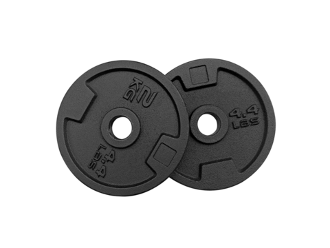 Pair of smooth barbell plates with matte elastomer surface, clean center bores and minimal detailing, isolated on transparent background.