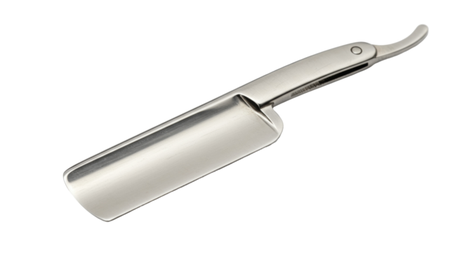 Silver straight razor isolated on transparent background, classic shaving tool for barbershop and personal grooming PNG