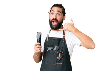 Young barber man over isolated chroma key background making phone gesture. Call me back sign