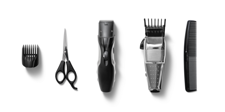 Photo of collection of barber tools including combs, scissors, clippers, and razors isolated on transparent background