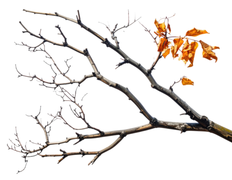 Bare tree branch with brown autumn leaves, isolated on a transparent background, depicting fall season change