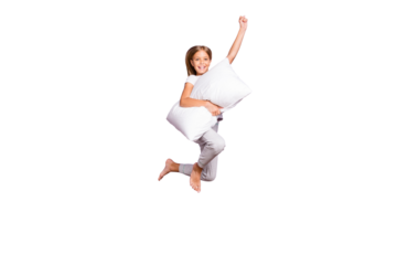 Full length photo of positive cheerful funny kid jump raise fist ahead imagine she strong superhero fly with pillow wear white comfort t-shirt pants barefoot isolated violet purple color background