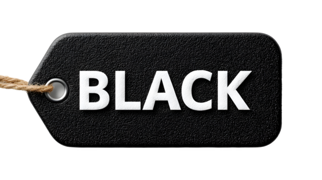 Dramatic black tag with bold white letters announces the Black Friday sale, promising incredible deals and savings for savvy shoppers everywhere