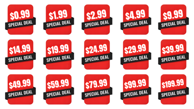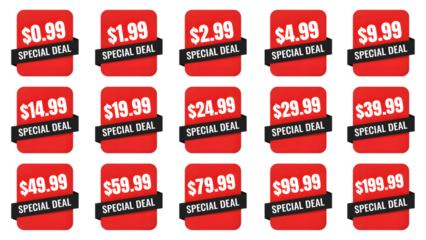 Vibrant red sale tag with bold white lettering, promoting discounts and bargains on transparent background
