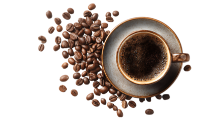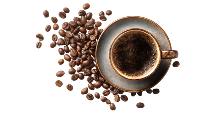 Latte art in a brown ceramic cup isolated on transparent background, coffee drink with heart and leaf pattern for cafe menu PNG