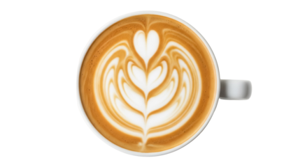 Latte art in a white cup isolated PNG on transparent background, coffee drink with heart and tulip pattern for cafe menu