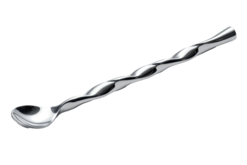 Long stainless steel spoon with twisted handle designed for cocktails shown on white background