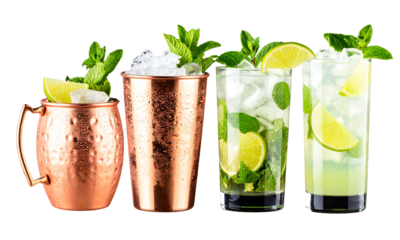 Four refreshing cocktails with lime and mint isolated on transparent background