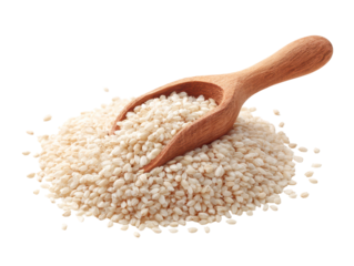 Pearled barley pile with a small wooden scoop and crisp grain texture, isolated on transparent background.