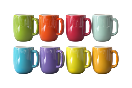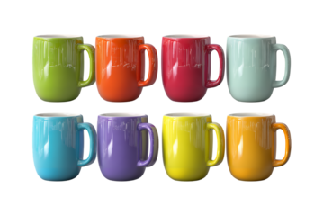 Collection of eight vibrant ceramic mugs arranged in two rows displaying a spectrum of bright colors for beverages isolated on transparent background