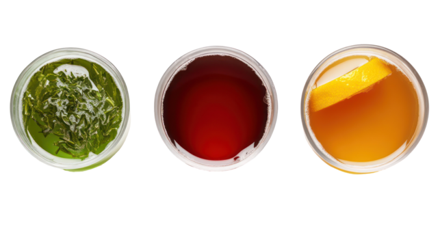 Three Japanese drinks including green tea yuzu juice and barley tea isolated on transparent background