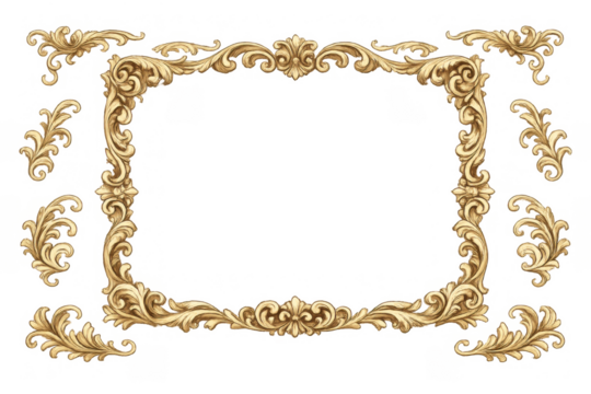 Gold ornate frame corners and decorative scroll elements in a baroque and rococo style. Detailed vintage design on transparent background