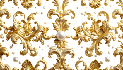 Ornate gold scrollwork with pearls on a black backdrop; classical design