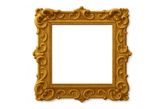 Ornate gold frame with gilded baroque design on transparent background