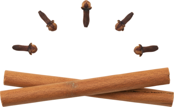 Five whole cloves are scattered above two crossed cinnamon sticks presenting aromatic baking spices against a black void Food Ingredient Flavor Brown Dried
