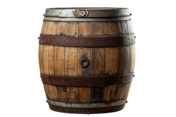 Classic wooden barrel with metal accents ideal for rustic settings, isolated on a transparent background, png, alpha