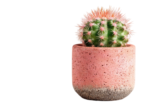 Vibrant cactus with pink blossom in geometric pot on transparent background