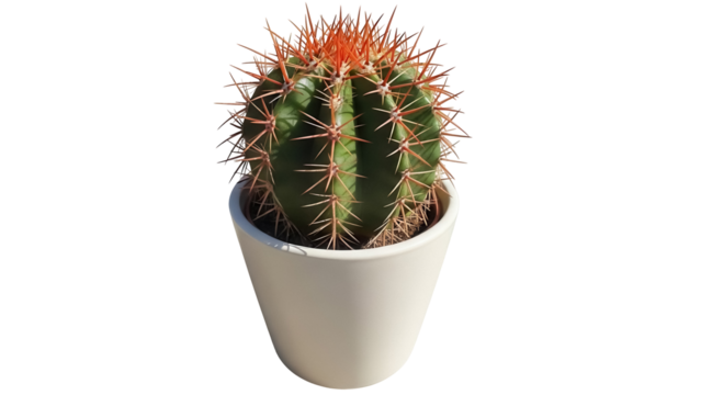 Green barrel cactus in red pot isolated PNG, spiky succulent plant on transparent background for desert flora and home decor