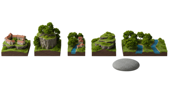 Snow-Covered Rocky Hills With Bare Trees Set. Winter Landscape And Nature Collection Isolated On Transparent Background