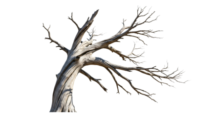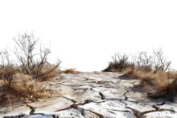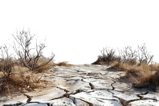 Dry and cracked soil in barren desert landscape isolated on transparent background. Lifeless wasteland due to climate change