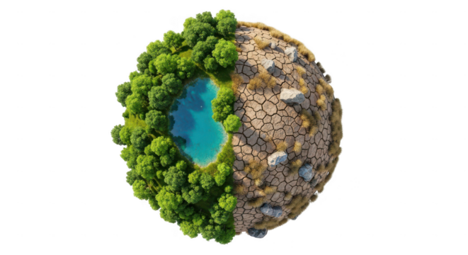 Dry cracked earth isolated on transparent background, representing drought, climate change, and desertification