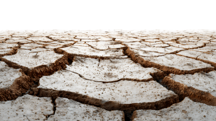 Closeup view of deeply cracked dry earth revealing parched arid texture isolated on transparent background