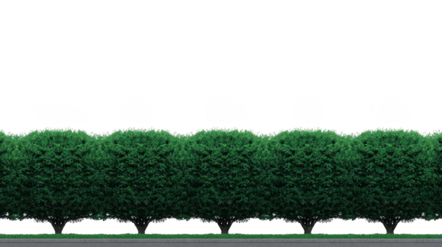 Row of lush green hedge bushes with dense foliage, trimmed neatly along sidewalk, creating natural barrier and peaceful outdoor atmosphere, perfect for landscaping design