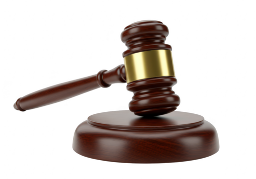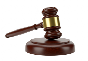 A wooden gavel rests on its circular base, symbolizing justice and authority in a courtroom setting