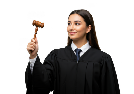 Young woman in judicial robe holding a gavel isolated on transparent background
