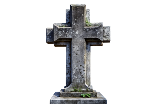Spooky grey stone gravestone cross isolated for halloween decorations and gothic art projects transparent background