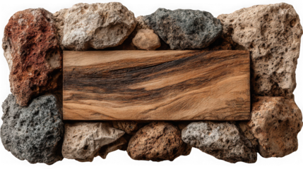A textured frame of various rough volcanic rocks surrounding a wooden plank, isolated on a transparent background