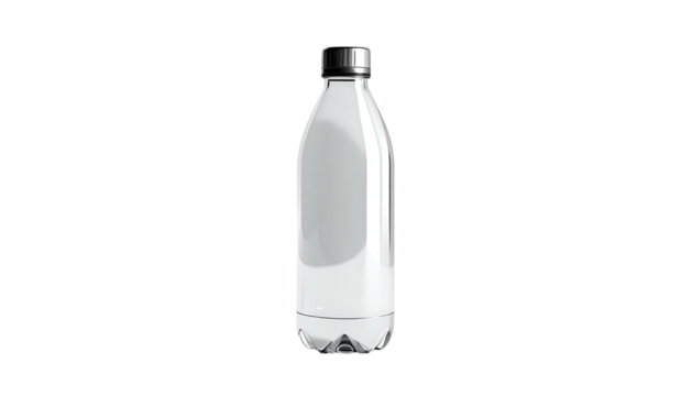 A tall, transparent plastic container with a blue cap and filled with clear liquid