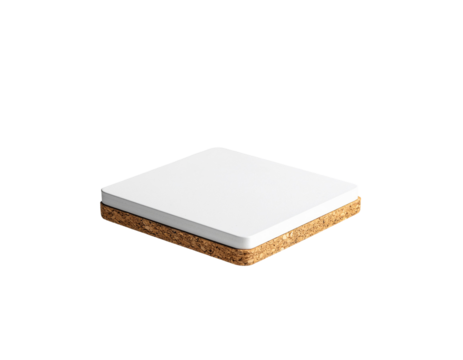 A minimalist square platform with a white top surface and a cork base, suitable for display or presentation purposes