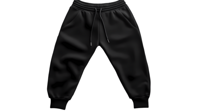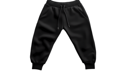 A pair of black sweatpants with a drawstring and pockets isolated  in a studio isolated on transparent background