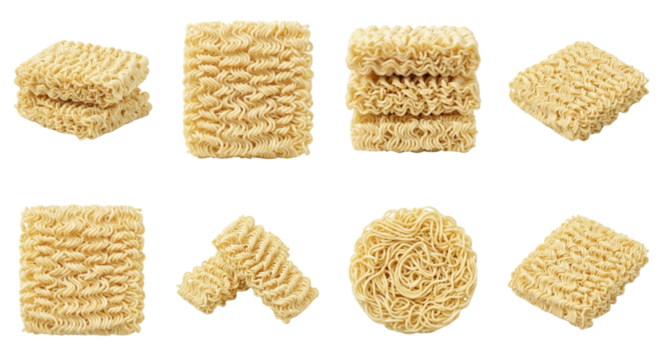 Instant Ramen Noodles Collection: Various Shapes and Stacks
