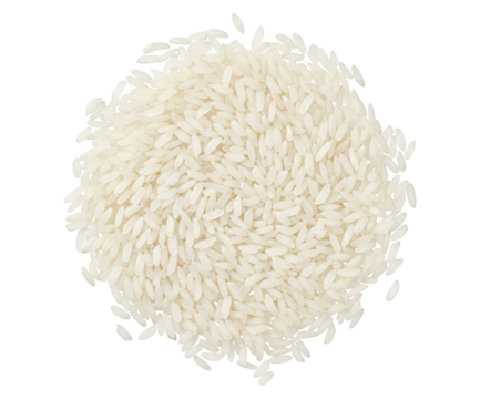 Top view of dry white rice grains forming a circular heap, a staple food ingredient ready for cooking