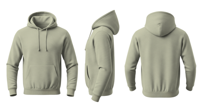 Blank Cream Hoodie Mockup Front, Side, and Back Views on Transparent Background