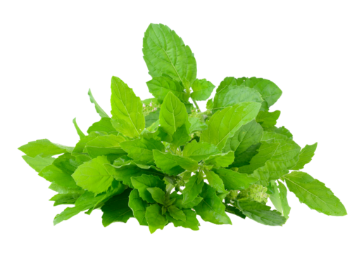 Fresh holy basil leaf collection with vibrant green color and natural texture floating on transparent background for healthy herbal use