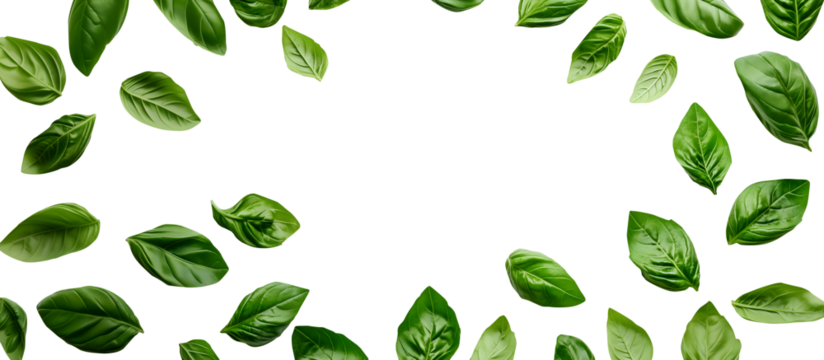Basil leaf spice plant flavouring remedy herb, scattered fly surround on transparent background cutout PNG file. Mockup template for artwork design. Wallpaper banner border