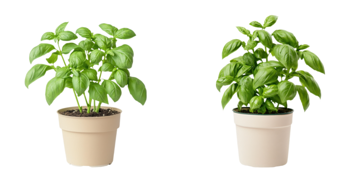 Fresh green organic basil bush on white, transparent background, PNG. Indoor plant growing, healthy eating, aromatic herb, food ingredient, spice for culinary