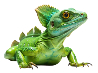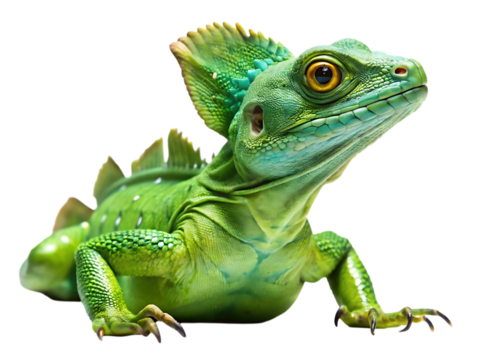 A beautiful close-up of a vibrant green basilisk lizard isolated on a black background
