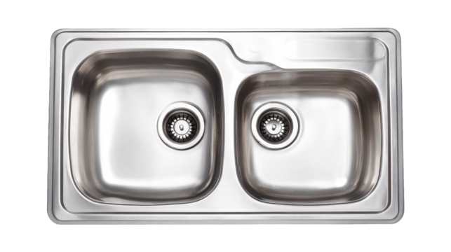 Stainless steel double kitchen sink featuring two identical wash basins and drains, providing essential plumbing for modern kitchen design and domestic utility, isolated