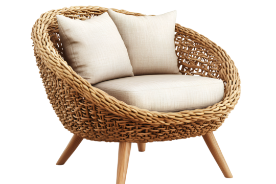 A rattan chair with wooden legs, a beige cushion on the seat, and a transparent background PNG