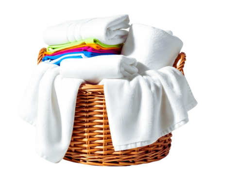 Wicker basket filled with clean folded white and colorful towels isolated on transparent background