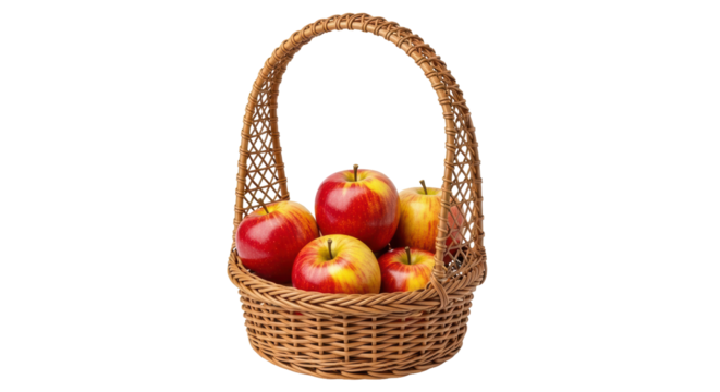 A rustic wicker basket filled with an abundance of fresh red apples Transparent PNG