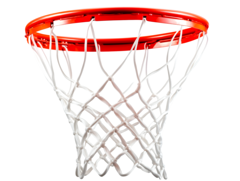 Orange basketball hoop with white net hanging, isolated on transparent background, ready for scoring