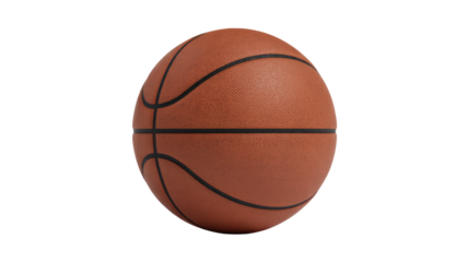 A classic orange-brown basketball with black seams, perfectly centered against a plain dark transparent background. Ideal for sports themes. background removed