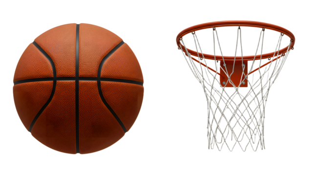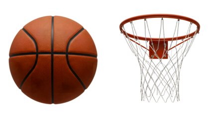 SPORT - Close-up of an orange basketball and a basketball hoop with net isolated on white background, perfect for sports and basketball themed projects
